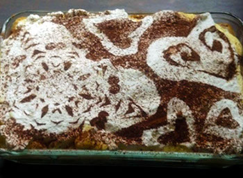 How did Carla make that design on the top of her Tiramisu dessert? She first cut a stencil out of parchment paper, then gently laid it on top of this delicious layered cake and dusted with cocoa.